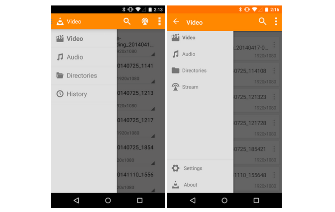 Přehrávač VLC téměř jistě získá nový vzhled celé aplikace, vedený přesně podle pravidel Material designu. Změn bude dost, ale ke zhoršení ovládání aplikace to rozhodně nepovede. Již dnes obsahuje přehrávač na operačním systému Android na levé straně vysouvací lištu, kde došlo k mírné změně tlačítka a lišty. Další změnou je odstranění jednoho tlačítka z pravého horního rohu, kde nově zůstala lupa pro vyhledávání a tři tečky značící volby. Během přehrávání videa byly upraveny tipy, kde jsou nyní položky v kulatých ikonkách.