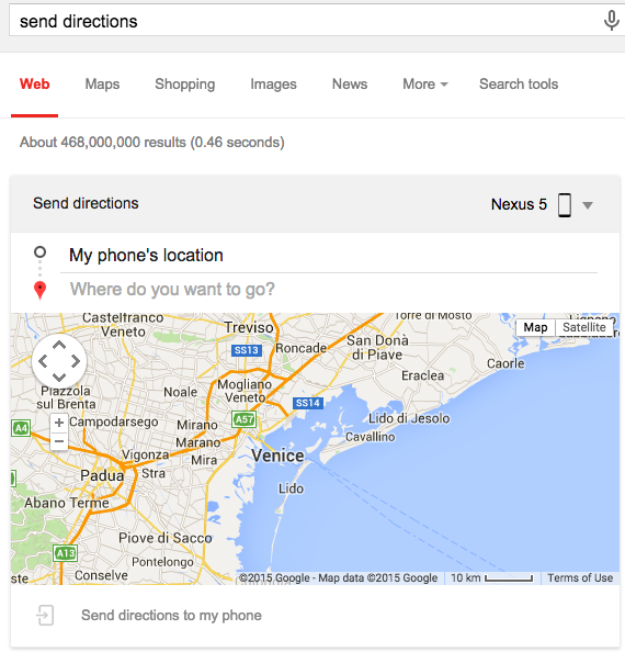 V tomto týdnu se objevila celkem zajímavá novinka v rámci webového prohlížeče Google.com. Pokud máte nastavený jazyk na angličtinu, možná si budete moci poslat trasu z vyhledávače přímo do smartphonu či tabletu s Androidem. Stačí zadat do vyhledávání “send directions” a následně si navolit cestu. Pak jen stačí kliknout na spodní tlačítko “Send directions to my phone”.
