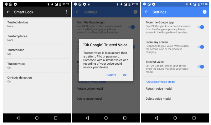 Novinkou je „Důvěryhodný hlas“ v rámci funkce Smart Lock. Zařízení se odemkne, jakmile na něj promluvíte a systém rozpozná hlas majitele. Google zároveň upozorňuje, že je stále bezpečnější používat znak, PIN nebo heslo, jelikož zařízení může odemknout i třetí osoba, která má podobný hlas. Asi bude možné odemknout smartphone i s nahrávkou hlasu.