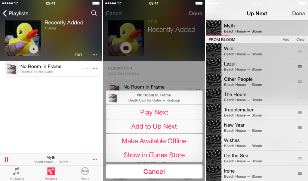 Je tu nový mini přehrávač, který zůstane i při brouzdání v aplikaci dostupný, globální vyhledávání písniček a umělců a v neposlední řadě obsahuje funkci ”Up Next”, což je fronta vámi navolených skladeb. Dále určitě uvítáte uhlazenější rozhraní rádia, které vám umožní objevovat nové skladby. Bohužel zde neexistuje žádná služba Beats, o které se mluvilo v souvislosti s iOS 8.4 a zůstane asi utajena až do další konference vývojářů. Pokud ovšem již existuje, tak zůstane pod pokličkou ještě nějakou chvíli.