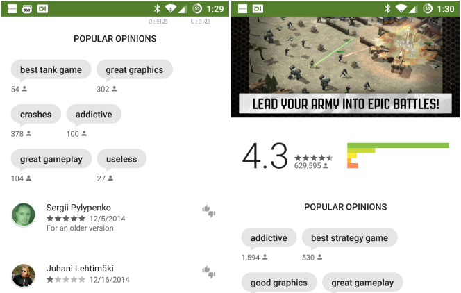 Druhá, a snad i podstatnější novinka, se týká recenzí. Ty jsou všeobecně pod palbou uživatelů, jelikož vkládané texty a hodnocení nejsou mnohdy relevantní. Případně se objevují absurdní recenze. Zřejmě z toho důvodu se Google rozhodl implementovat novou sekci, která zobrazuje nejčastější názory. Jednotlivě se zobrazují v bublinách, u kterých je i číslo vyjadřující jejich výskyt v recenzích.
