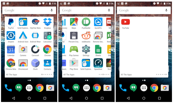 Mimo tuto podstatnou změnu jsme se dočkali úpravy u složek na hlavní ploše. V současné verzi lze takto naskládat jen 16 aplikací, avšak nová verze z Androidu M již umožňuje větší obsah. Zajímavostí je, že se zde Google rozhodl pro horizontální posouvání. Uvidíme, jestli se tato verze dostane do oficiální distribuce, nebo se jedná pouze o experiment.