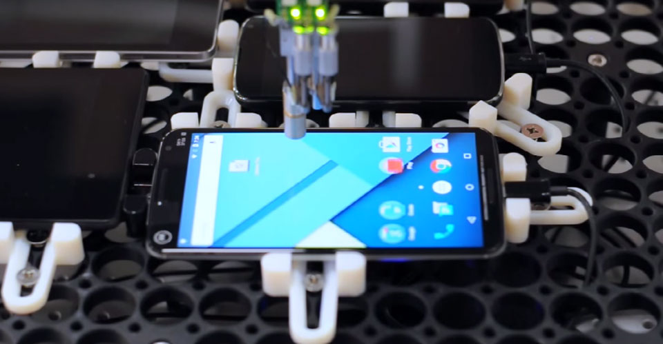 Stroj, jenž můžete vidět na videu níže, má za úkol odchytávat sebemenší odchylky mezi dotykem vašeho prstu a správným zobrazením obsahu na displeji zařízení. Funguje na jednoduchém principu. Opticky zachytává dění na obrazovce, které je vždy totožné, tudíž porovnávání výsledků je poté snazší.