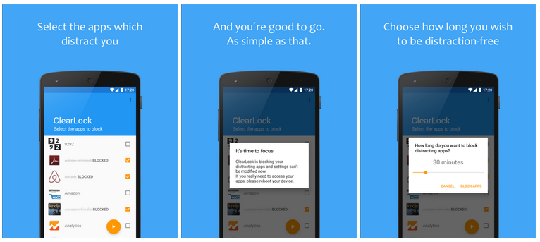 ClearLock vám umožňuje chytře vybrat aplikace, jež budou mít zakázány jakkoliv rozezvonit váš telefon. Aplikace je propracovaná a dává svým uživatelům pokročilé možnosti v podobě nastavení různých intervalů blokování. Pokud si uděláte seznam blokovaných aplikací například na 30 minut, pak tyto aplikace nespustíte ani vy samotní. Při zkoušce zapnutí dojde k okamžitému vypnutí, což má za úkol ClearLock. Při prvotním otevření je nutné povolení ClearLocku v systému jako správce, aby mohla aplikace pracovat správně a dokázala další aplikace ukončovat. Orientace v aplikaci je velmi jednoduchá a na první pohled budete okamžitě vědět, co máte vlastně dělat.